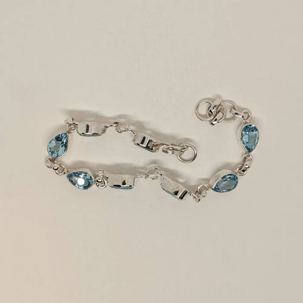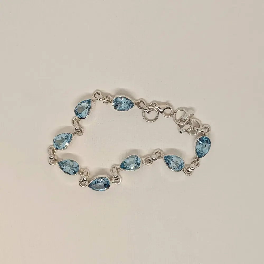 Elegant and light‑catching, this bracelet features a flowing sequence of pear‑shaped and oval blue topaz stones that bring a fresh, luminous energy to the wrist. The bright sky‑blue colour feels uplifting and feminine, while the polished silver keeps the design modern and versatile. Its sparkling faceted surfaces create a soft, watery glow, making it perfect for layering with other silver pieces or wearing alone as a delicate statement. Designed for everyday wear or special occasions, it carries a serene, graceful presence that complements any style.