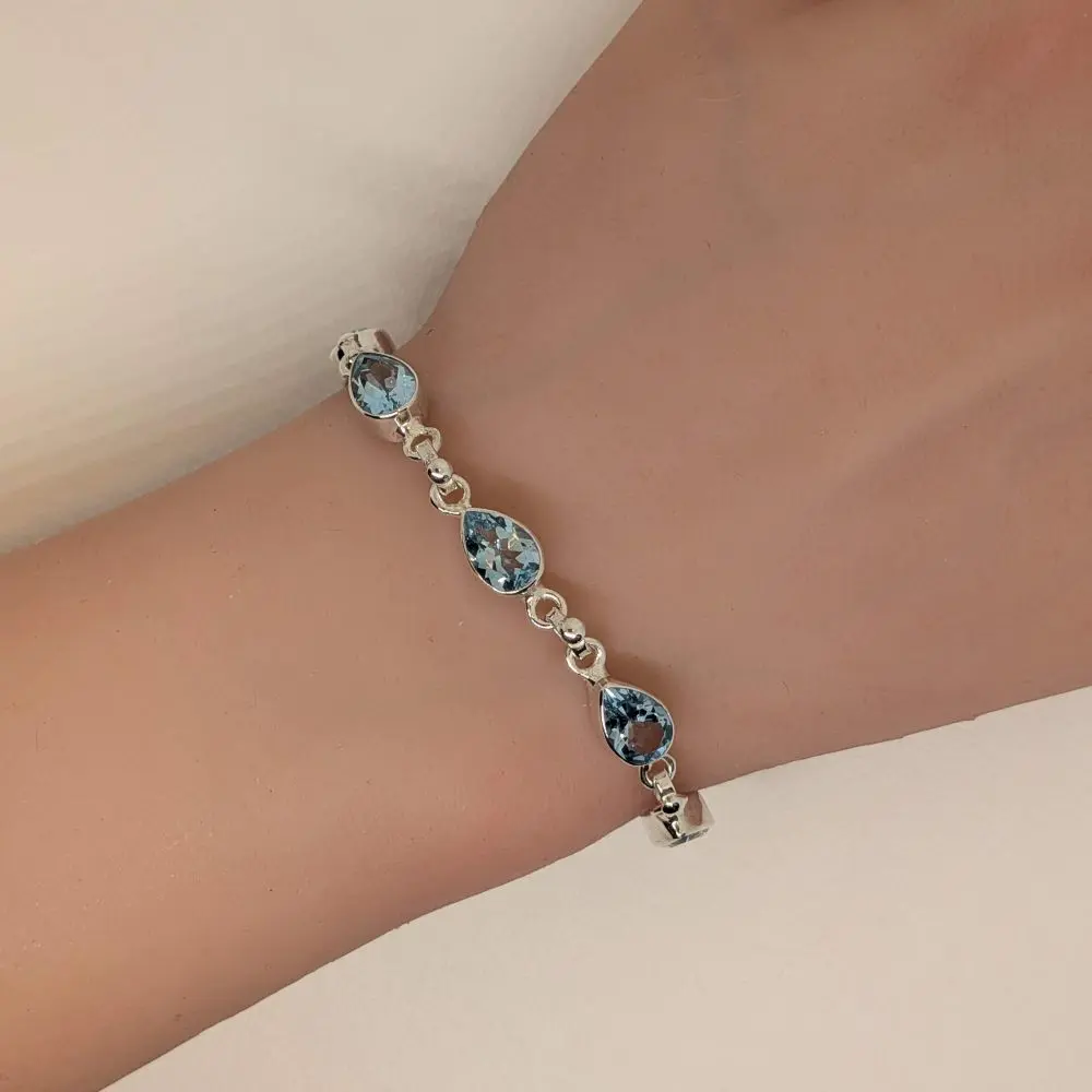 This beautiful blue topaz bracelet is crafted in solid 925 sterling silver and set with a series of pear‑shaped and oval‑cut gemstones in a bright, clear shade of sky‑blue. This lighter tone is fresh, radiant, and uplifting, a crisp blue that reflects light with sparkling clarity. Each stone is faceted to enhance its brilliance, creating a luminous shimmer with every movement of the wrist.