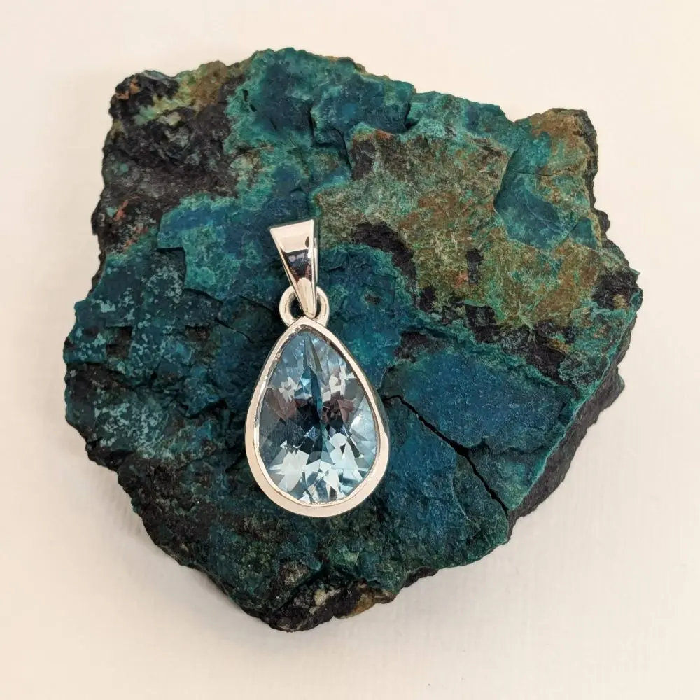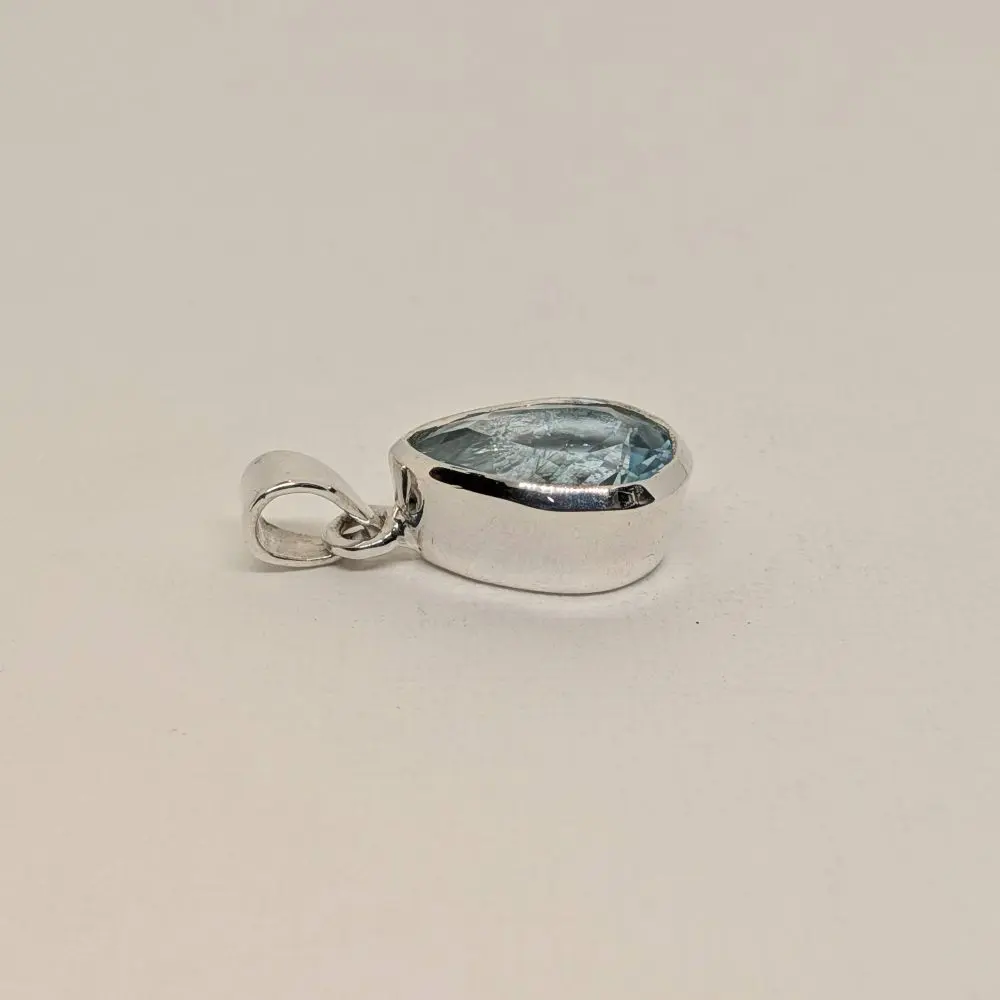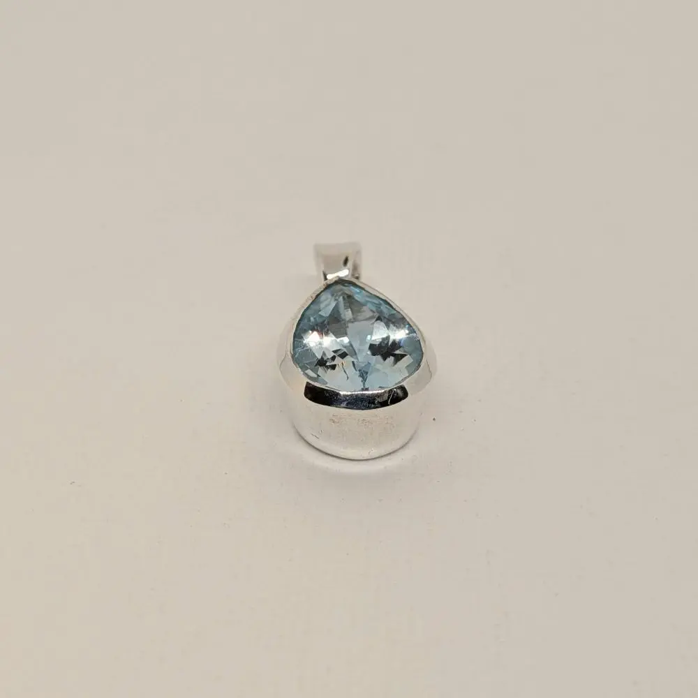 Soft, elegant, and effortlessly refined, this pendant features a radiant blue topaz stone that glows with a fresh, vibrant energy. The pear shape adds a gentle sense of movement, while the polished silver keeps the design timeless and versatile. Its faceted surface shimmers beautifully in natural or evening light, making it perfect for layering with other silver pieces or wearing alone as a delicate yet striking statement. Designed for everyday wear or special occasions, it brings a sense of calm beauty and graceful simplicity to the neckline.