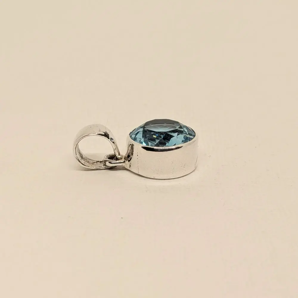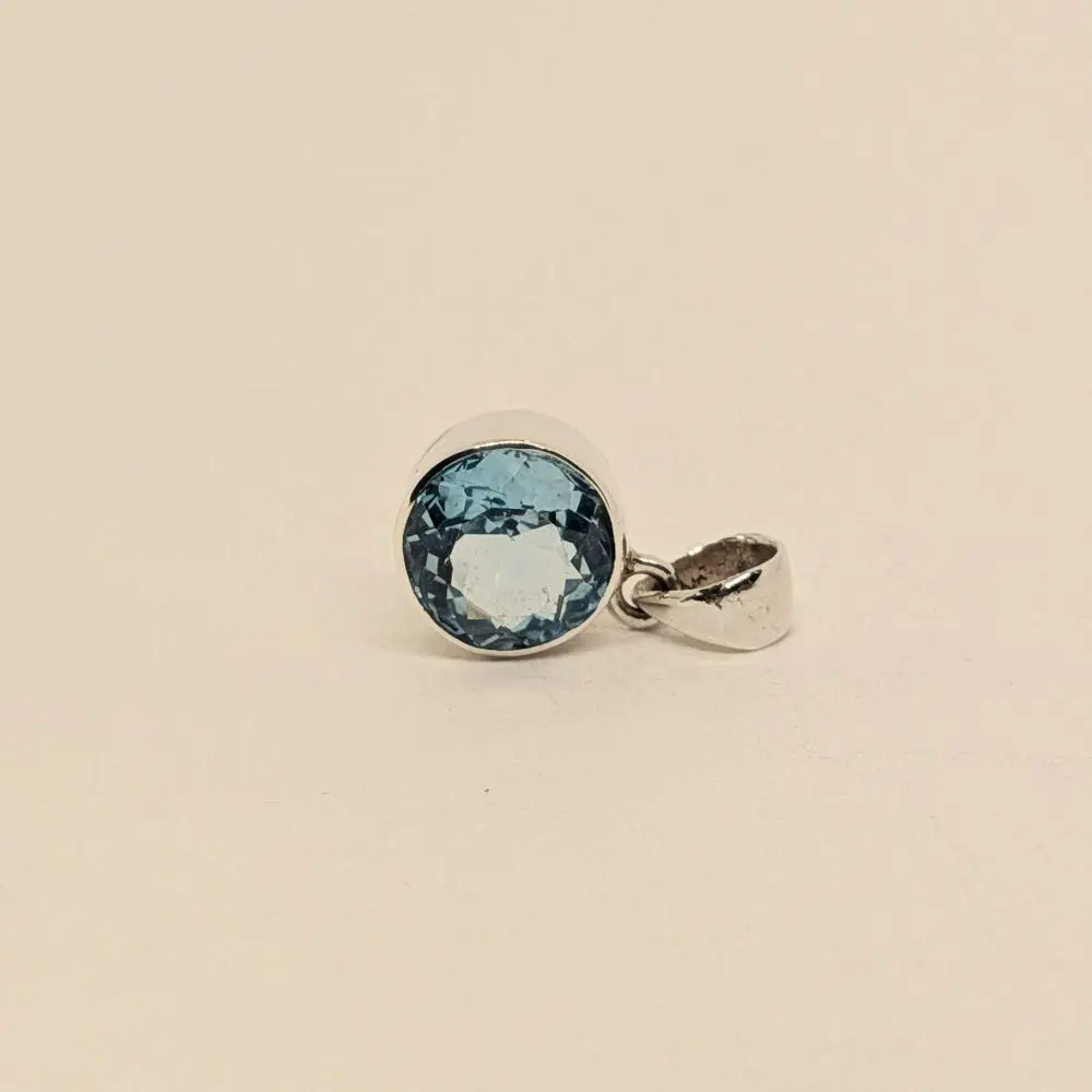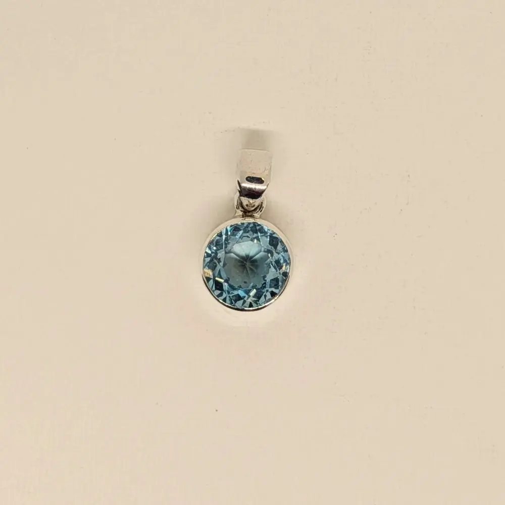 Elegant, simple, and effortlessly refined, this pendant features a radiant blue topaz stone that glows with a fresh, vibrant energy. The round cut adds balance and harmony, while the polished silver keeps the design timeless and versatile. Its faceted surface shimmers beautifully in natural or evening light, making it perfect for layering with other silver pieces or wearing alone as a delicate yet striking statement. Designed for everyday wear or special occasions, it brings a sense of calm beauty and graceful simplicity to the neckline.
