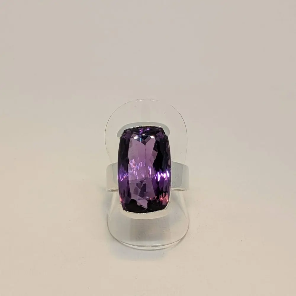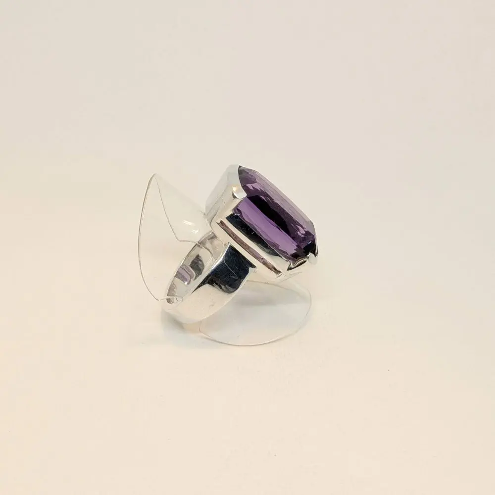 This ring features a substantial emerald‑cut amethyst with a rich, saturated purple tone and impressive depth. The elongated rectangular cut gives the stone a refined, architectural presence, while the faceting catches the light in clean, luminous flashes. Set in solid 925 sterling silver, the smooth bezel frames the gemstone with elegant simplicity, allowing its colour and clarity to take centre stage.