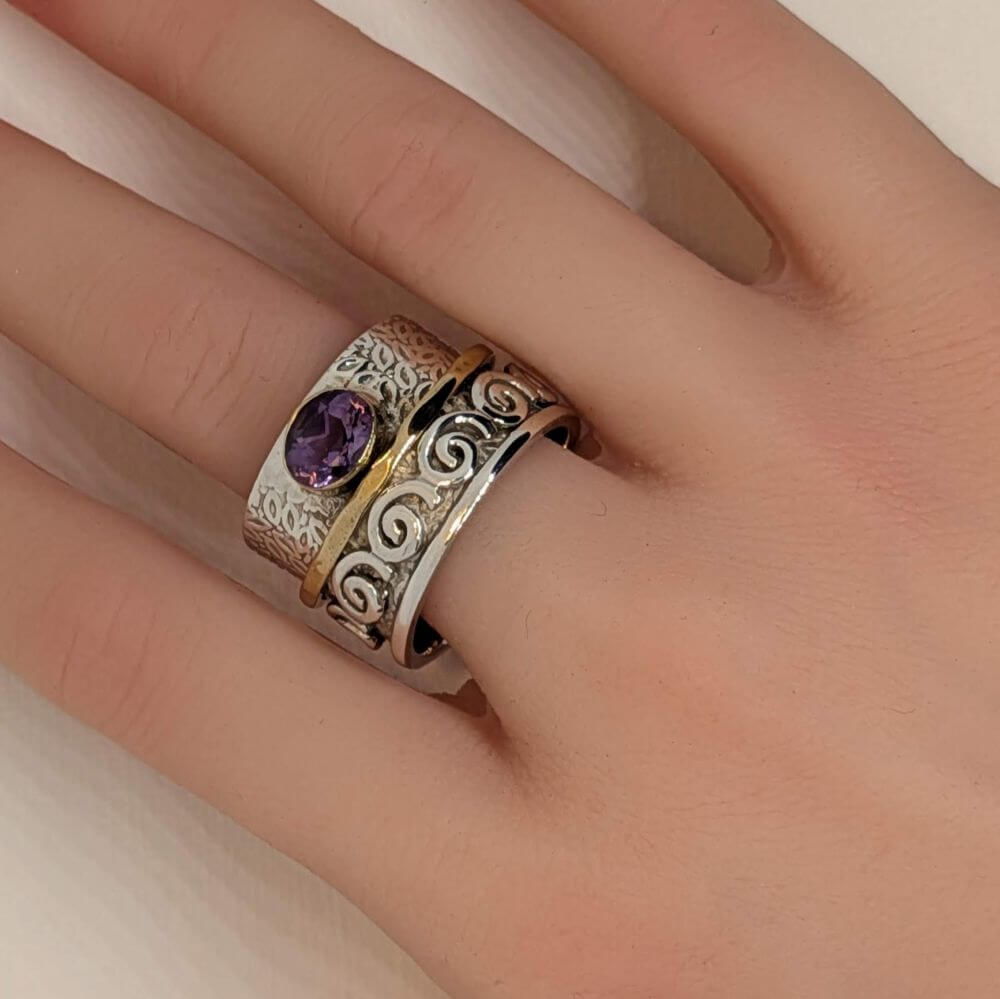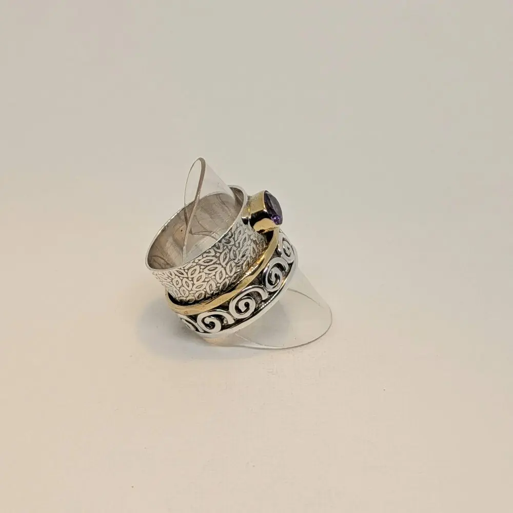 A sterling silver spinner ring with amethyst, spiral band, and brass accent