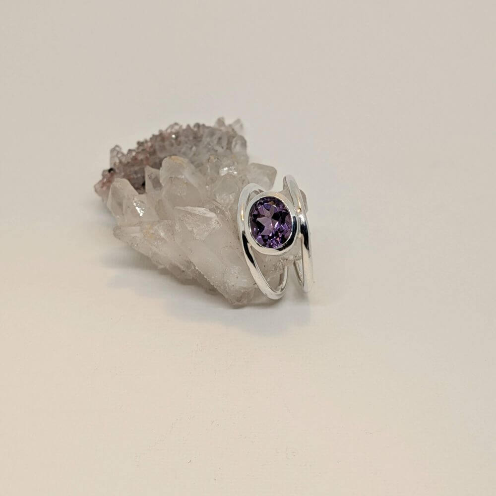 This ring has a modern, airy feel thanks to its open‑band structure, making it ideal for those who love jewellery with a sense of space and ease. The amethyst adds a touch of colour and intuitive energy, while the clean lines keep the piece elegant and versatile. It pairs beautifully with other silver rings or stands alone as a simple, graceful statement.