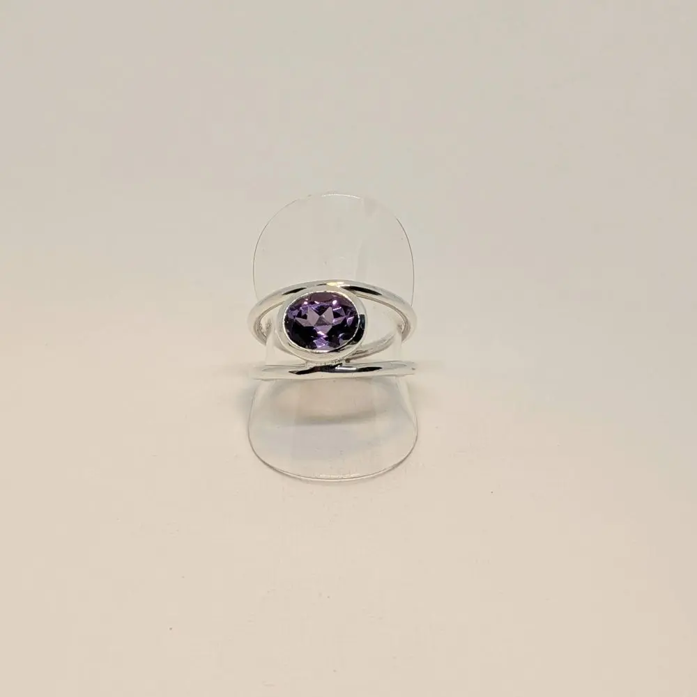 This ring features a beautifully faceted oval amethyst set in solid 925 sterling silver, framed by a contemporary split‑band design. The open structure gives the piece a sense of lightness and flow, allowing the gemstone to feel suspended between two clean, polished lines of silver. The deep violet tone of the amethyst catches the light with every movement, offering both colour and quiet elegance.