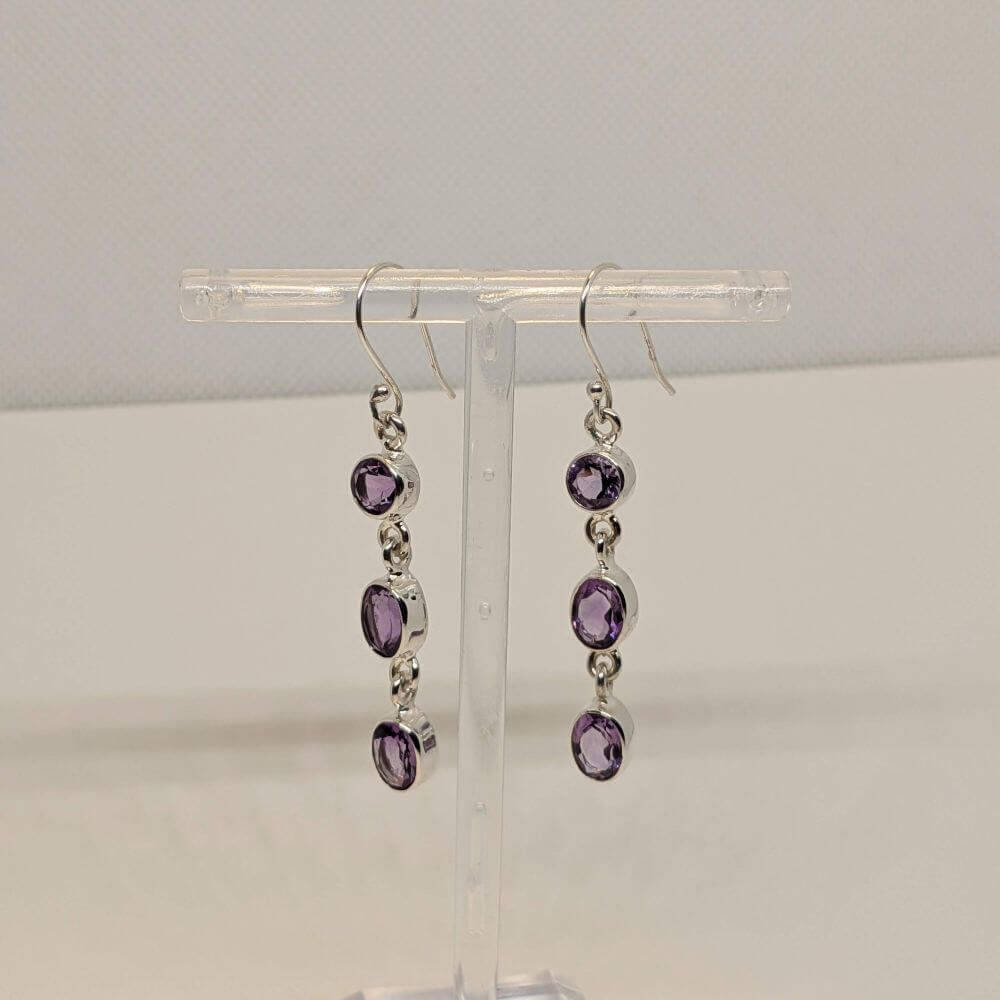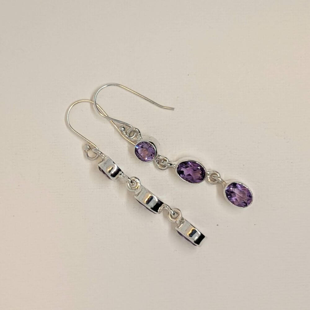 These earrings feature three oval‑cut amethyst gemstones arranged in a graceful vertical drop. Each stone has a rich violet tone and a bright, faceted surface that catches the light with every movement. The stones are linked with small sterling silver connectors, giving the earrings a soft, fluid sway that feels elegant and feminine. Set on solid 925 sterling silver hooks, they are lightweight, comfortable, and designed for effortless wear.