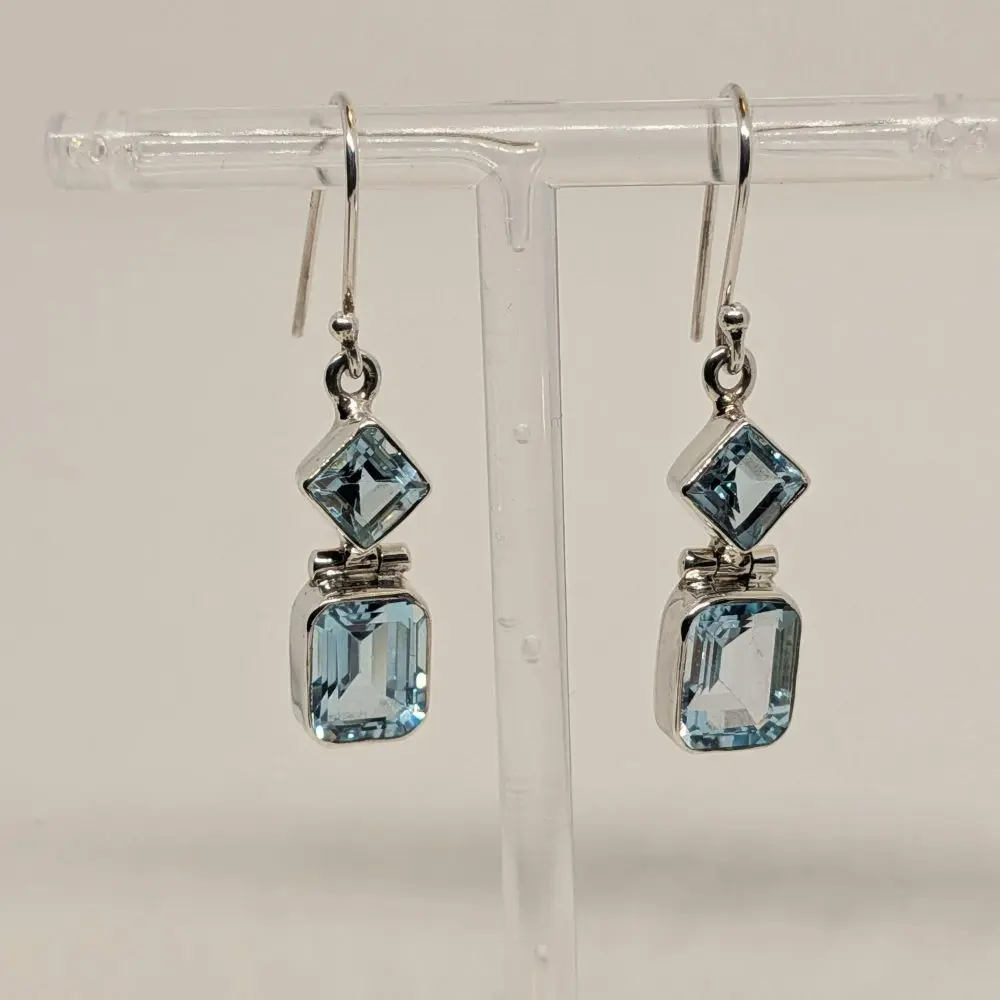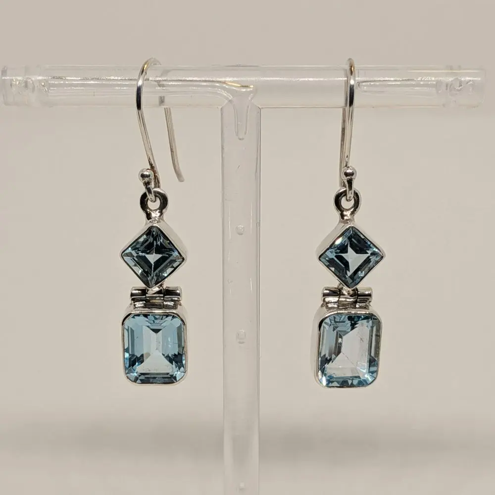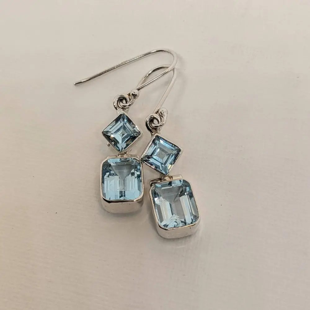 Elegant and effortlessly refined, these earrings feature a row of luminous blue topaz stones that glow with a fresh, vibrant energy. The baguette cut adds a sleek, contemporary edge, while the polished silver keeps the design timeless and versatile. Their faceted surfaces shimmer beautifully in natural or evening light, making them perfect for layering with other silver pieces or wearing alone as a subtle yet striking statement.
