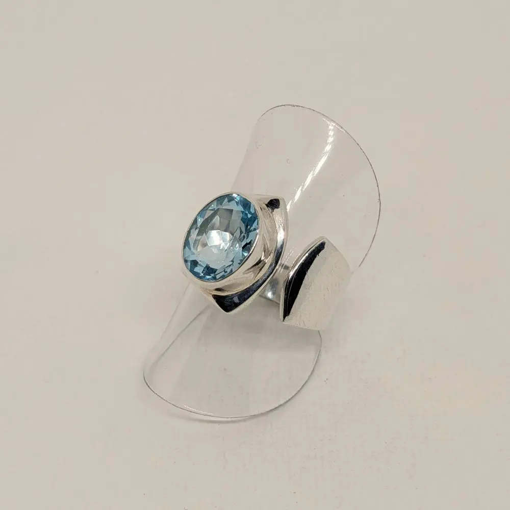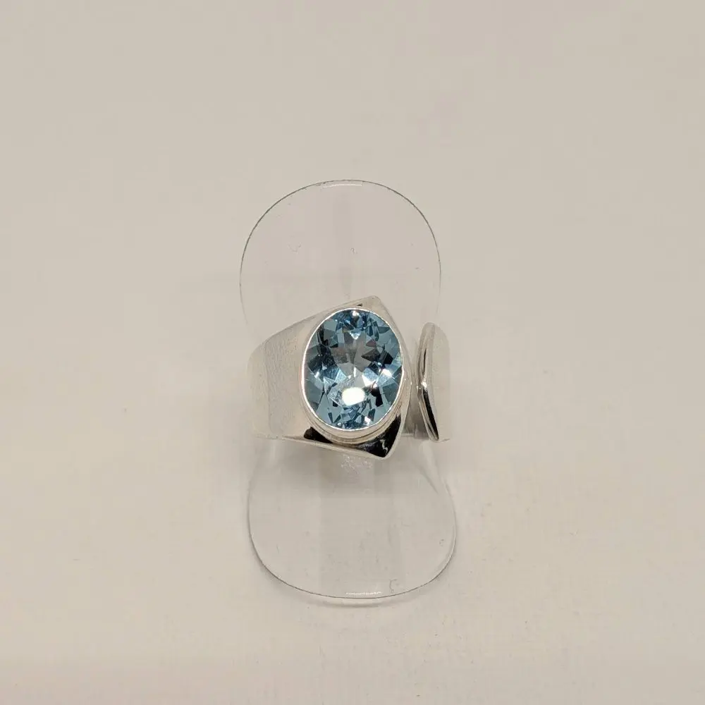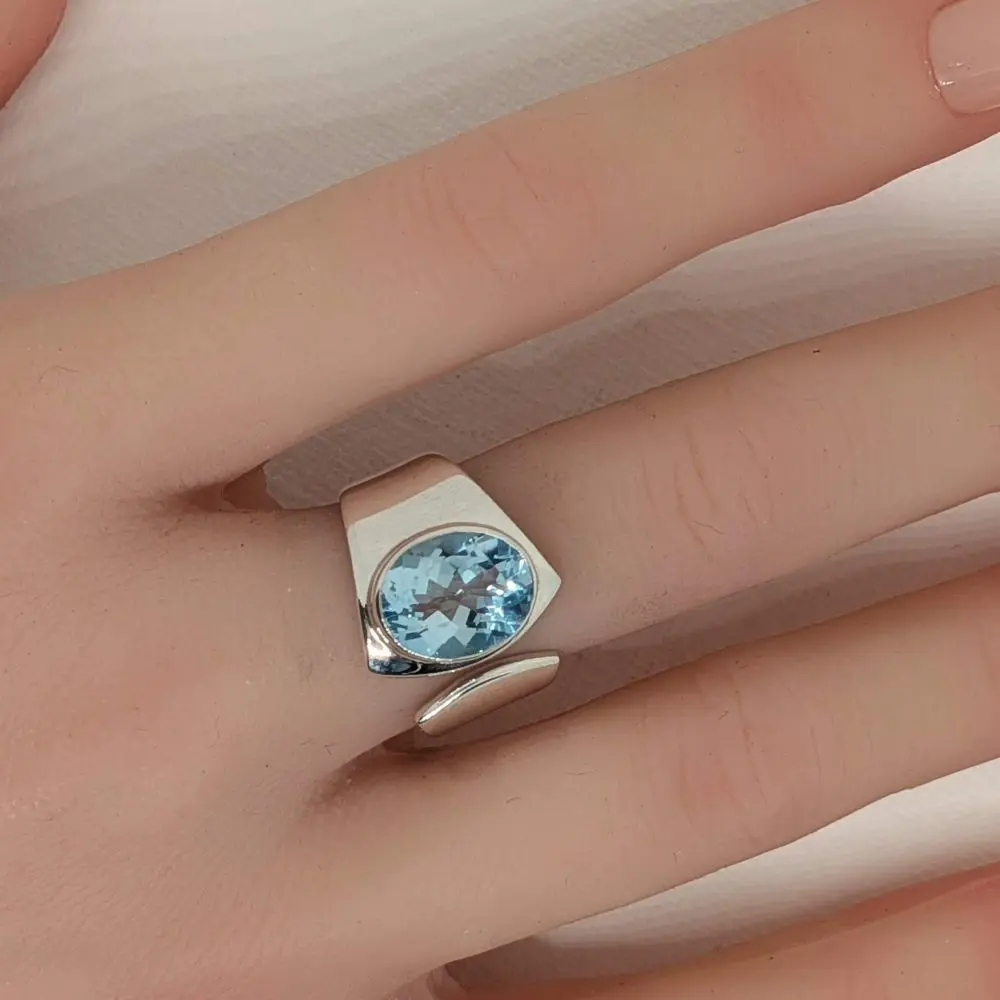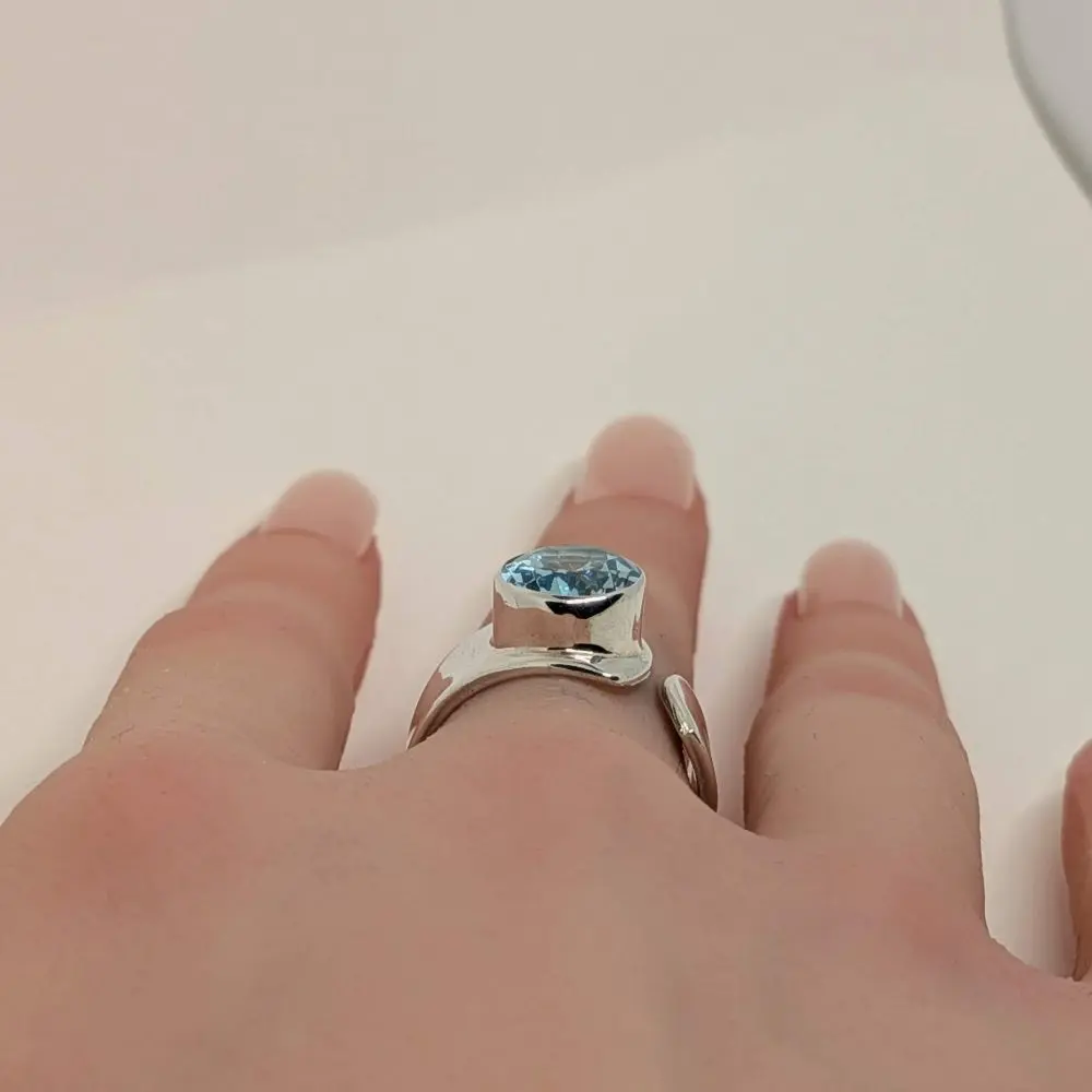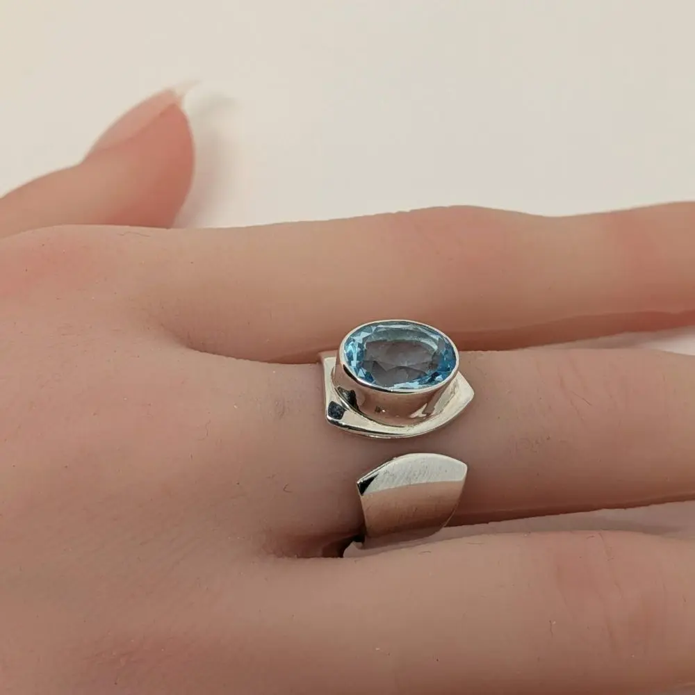 Light, graceful, and effortlessly elegant, this ring features a radiant blue topaz that glows with fresh, vibrant energy. The split band adds a contemporary touch while keeping the design open and comfortable, and the oval cut brings softness and fluidity. Its faceted surface catches the light beautifully, making it perfect for stacking with other silver pieces or wearing alone as a subtle yet striking statement. Designed for everyday wear and gentle adjustability, it brings a sense of calm beauty and refined simplicity to the hand.