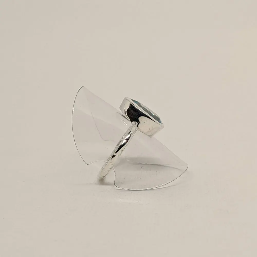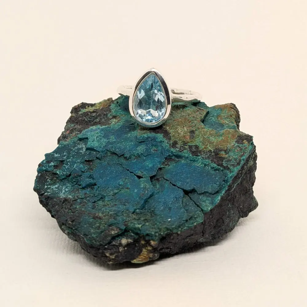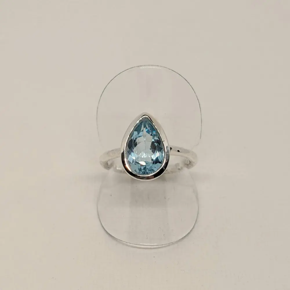 Soft, elegant, and effortlessly refined, this ring features a radiant blue topaz stone that glows with fresh, vibrant energy. The pear shape adds a gentle sense of movement, while the hand‑beaten band brings a touch of rustic artistry. Its faceted surface shimmers beautifully in natural or evening light, making it perfect for stacking with other silver pieces or wearing alone as a delicate yet striking statement. Designed for comfort and everyday elegance, it brings a sense of calm beauty and graceful simplicity to the hand.