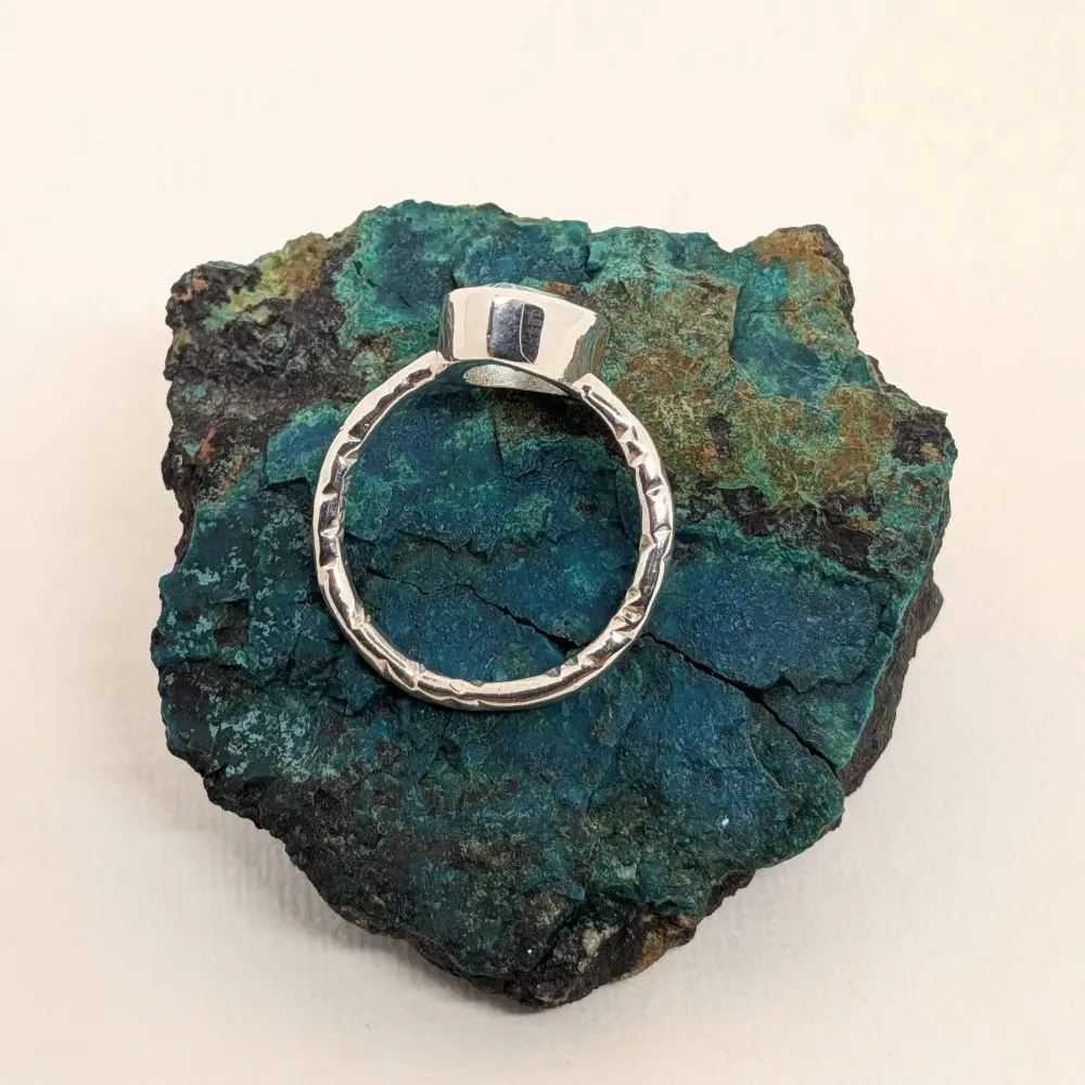 The gemstone is securely bezel‑set in polished sterling silver, resting on a hand‑beaten band that adds texture, character, and a distinctly artisanal feel. The contrast between the smooth bezel and the organic hammered finish gives the ring a contemporary yet earthy elegance. Designed for everyday wear or special occasions, this piece brings a touch of colour and understated sophistication to any look.