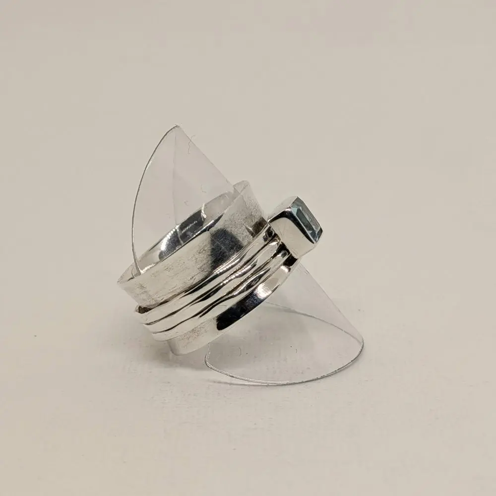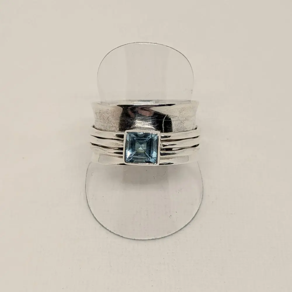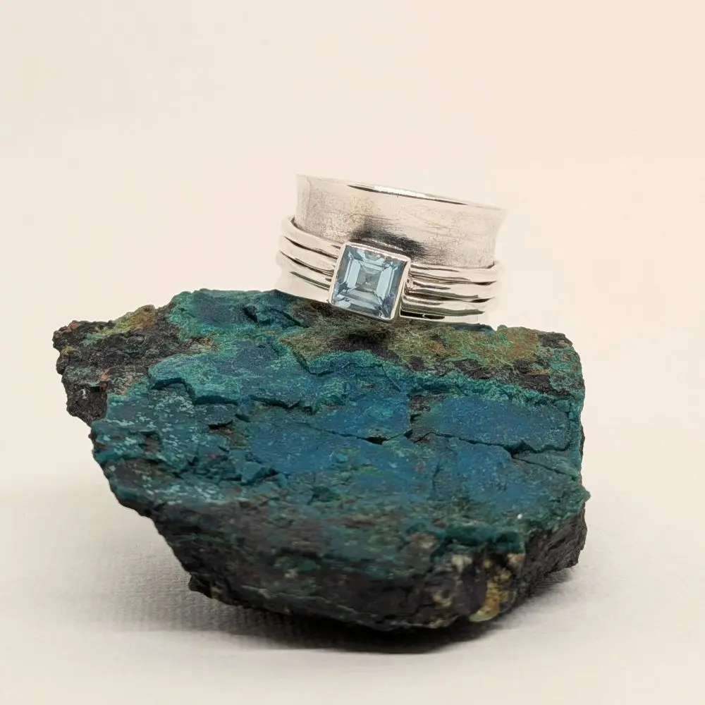 Elegant, modern, and full of character, this ring blends clean geometry with soft, organic movement. The square‑cut gemstone brings structure and clarity, while the loose fine bands can spin adding a playful, tactile element that makes the piece feel alive on the hand. Its luminous blue topaz catches the light beautifully, making it perfect worn alone as a statement or paired with other silver pieces for a layered look. Designed for comfort and everyday elegance, it brings a sense of clarity, calm, and contemporary beauty to any collection.