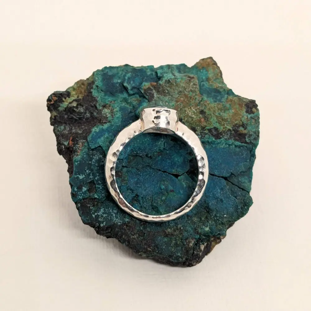 The gemstone is securely bezel‑set in polished sterling silver and elevated on a raised band, giving the ring a sculptural, contemporary presence. The lifted setting allows more light to reach the stone, enhancing its brilliance and creating a refined silhouette on the hand. Designed for everyday elegance or special occasions, this piece brings a touch of colour, confidence, and modern artistry to any look.