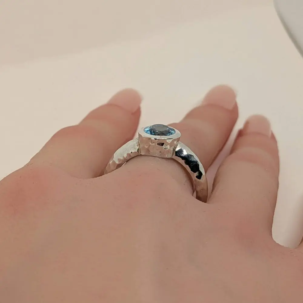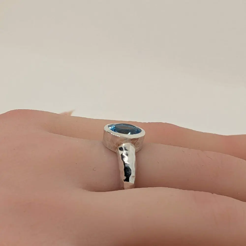 Elegant, bold, and effortlessly refined, this ring features a deep London Blue Topaz that glows with a rich, captivating energy. The raised band adds height and sculptural interest, while the polished bezel keeps the design sleek and timeless. Its faceted surface catches the light beautifully, making it perfect for stacking with other silver pieces or wearing alone as a striking statement. Designed for comfort and everyday sophistication, it brings a sense of depth, beauty, and quiet confidence to the hand.